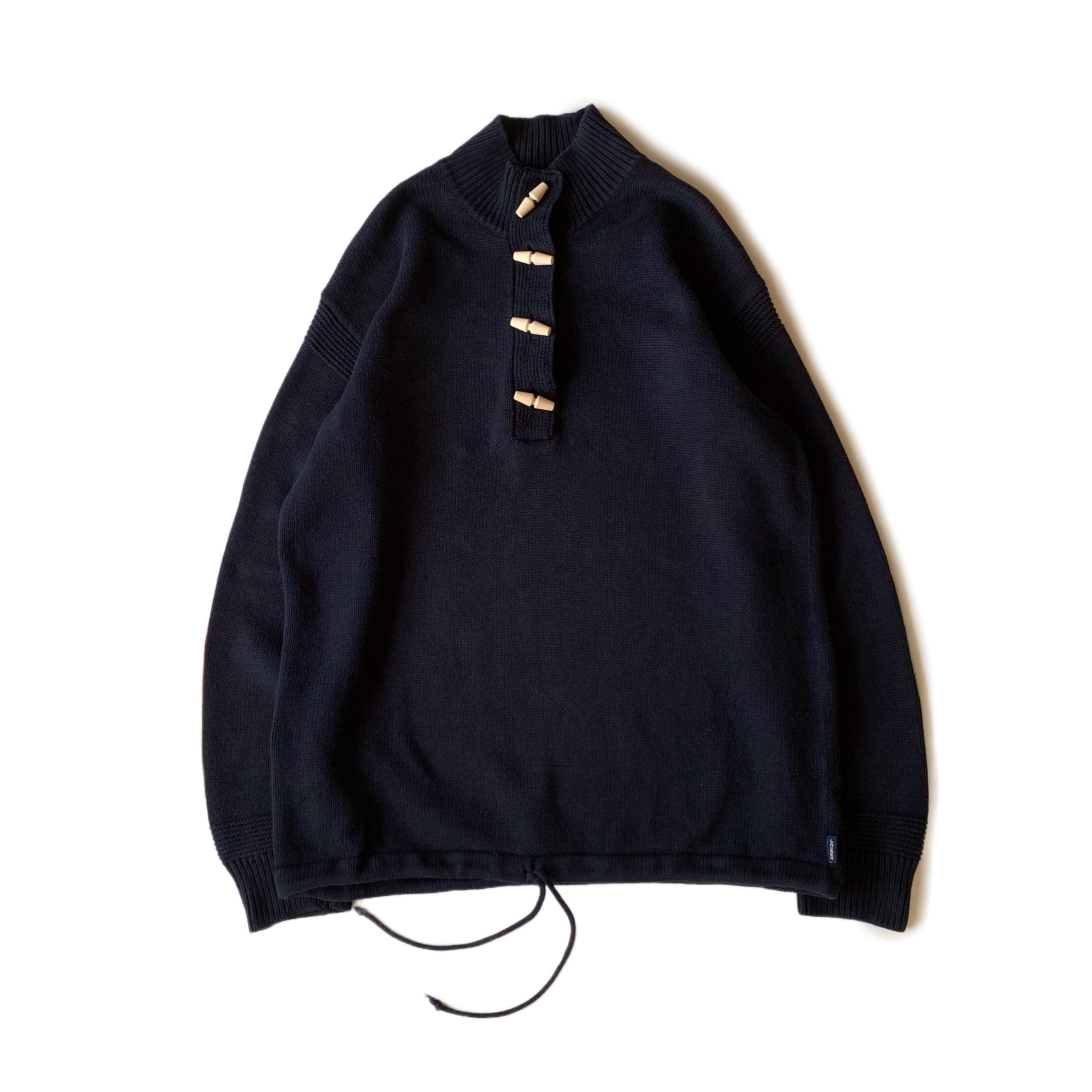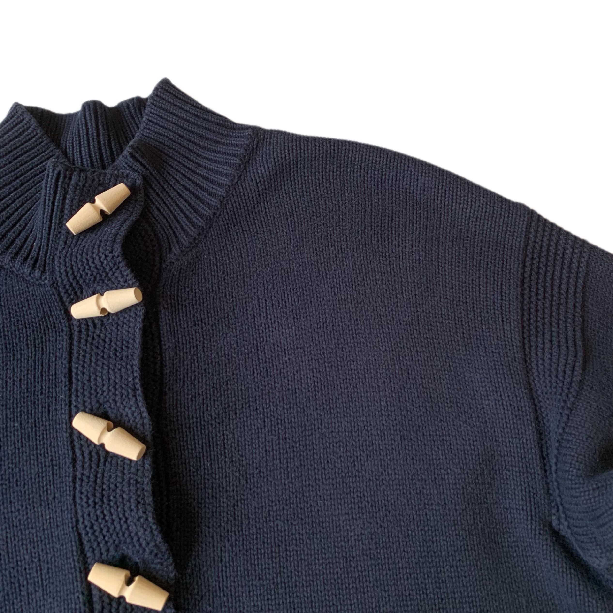 ハイネックの襟で、フロントはトグルによる開閉が可能です。裾にはドローコードがついており、絞ることで丸みのあるシルエットになります。
