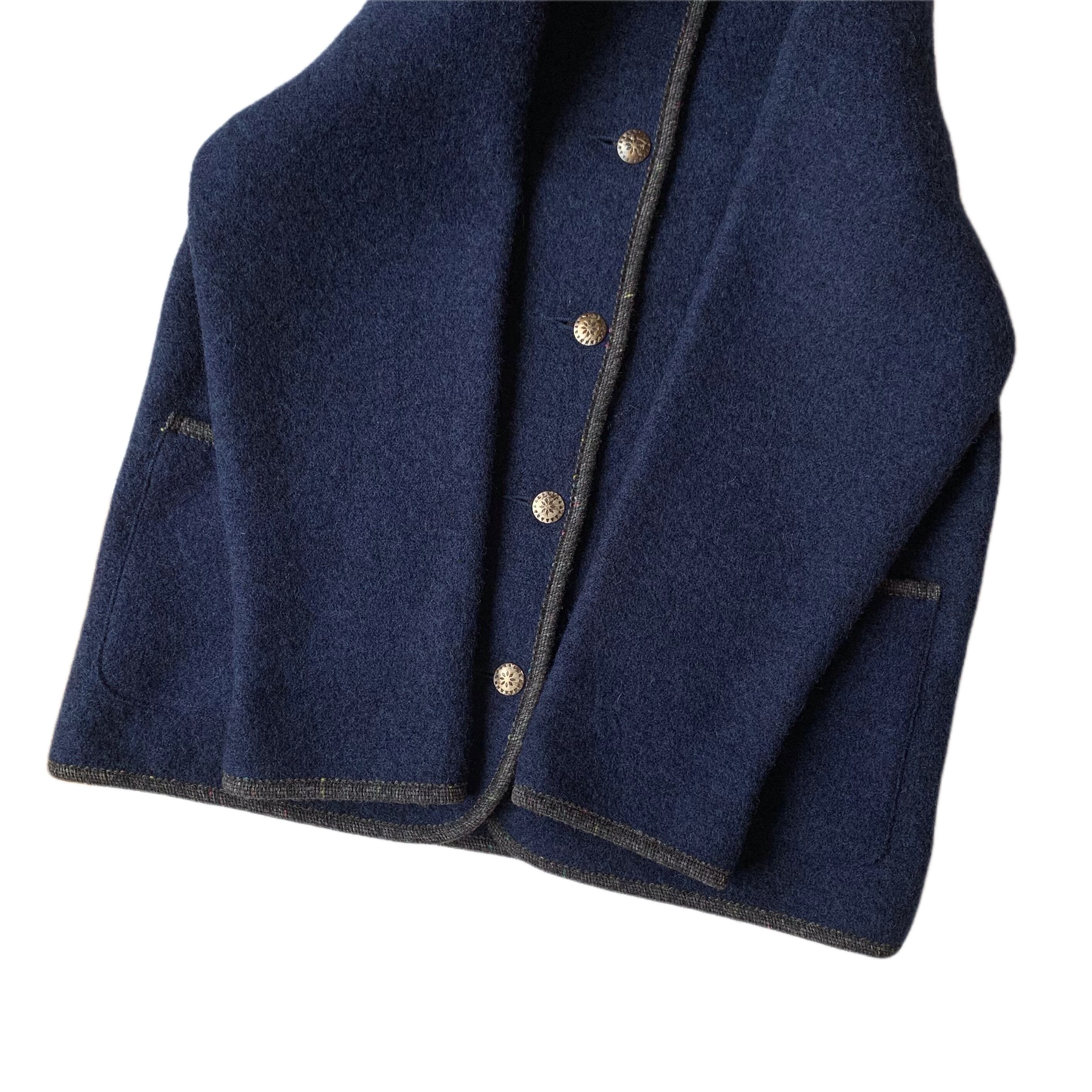 地厚な圧縮ウールにテープ飾りが付いたデザイン。フロントのボタンもしっかりとメタルボタンです。