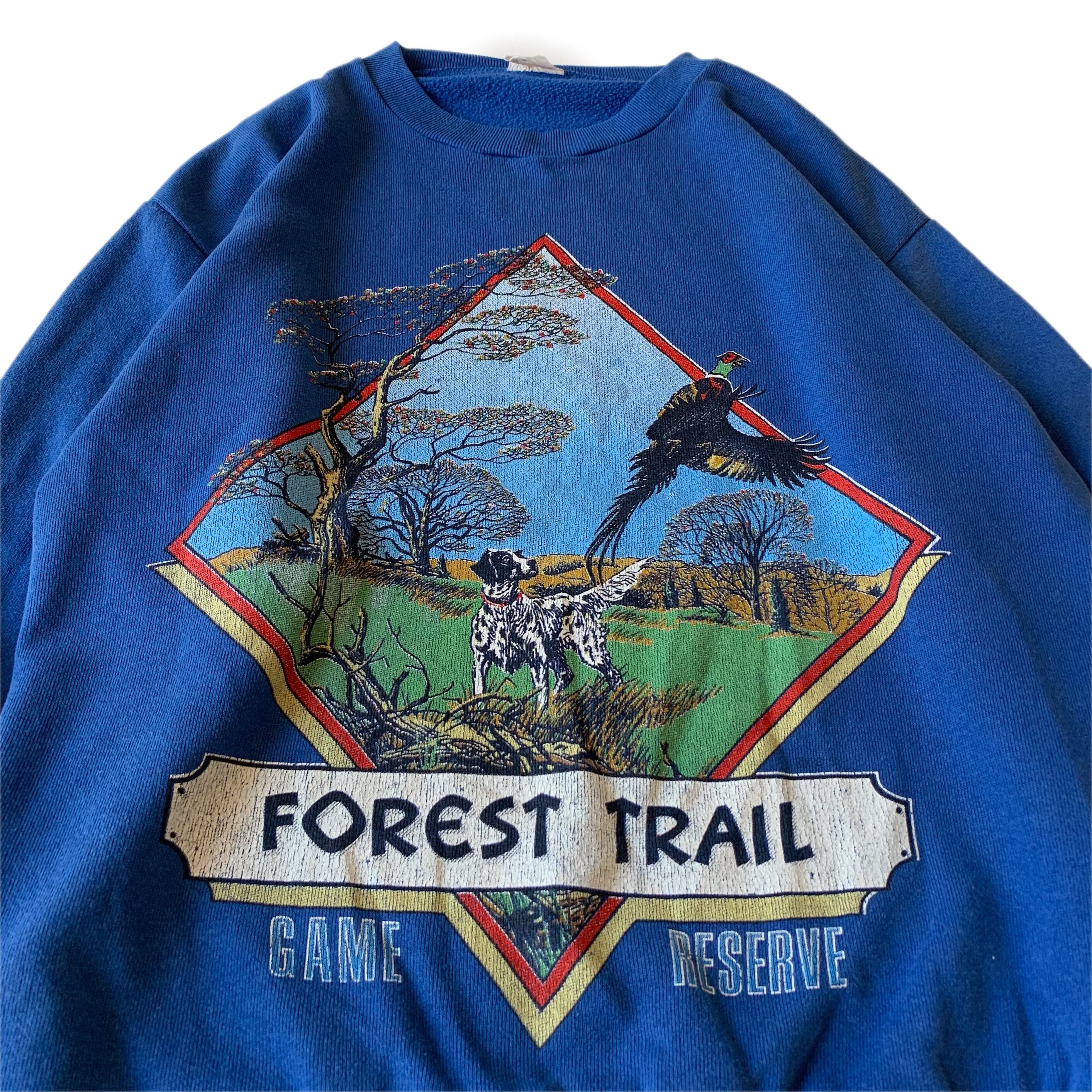 “FOREST TRAIL GAME RESERVE”という文字。高原にいるダルメシアンとキジのような鳥がプリントされています。