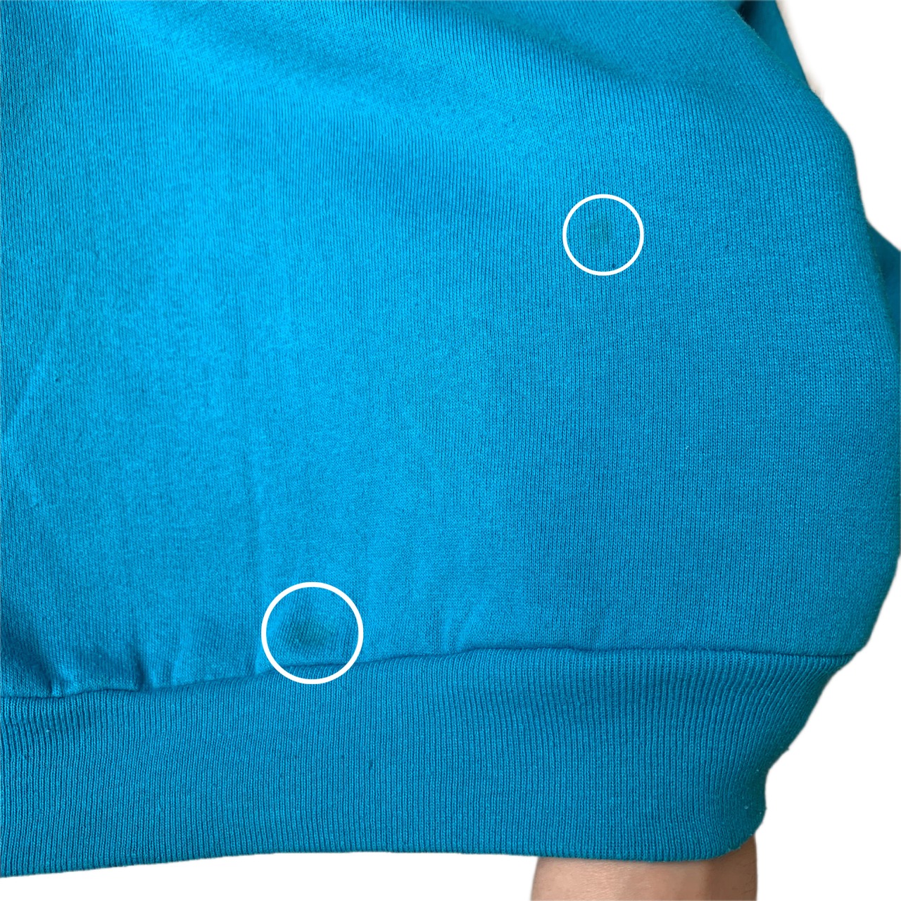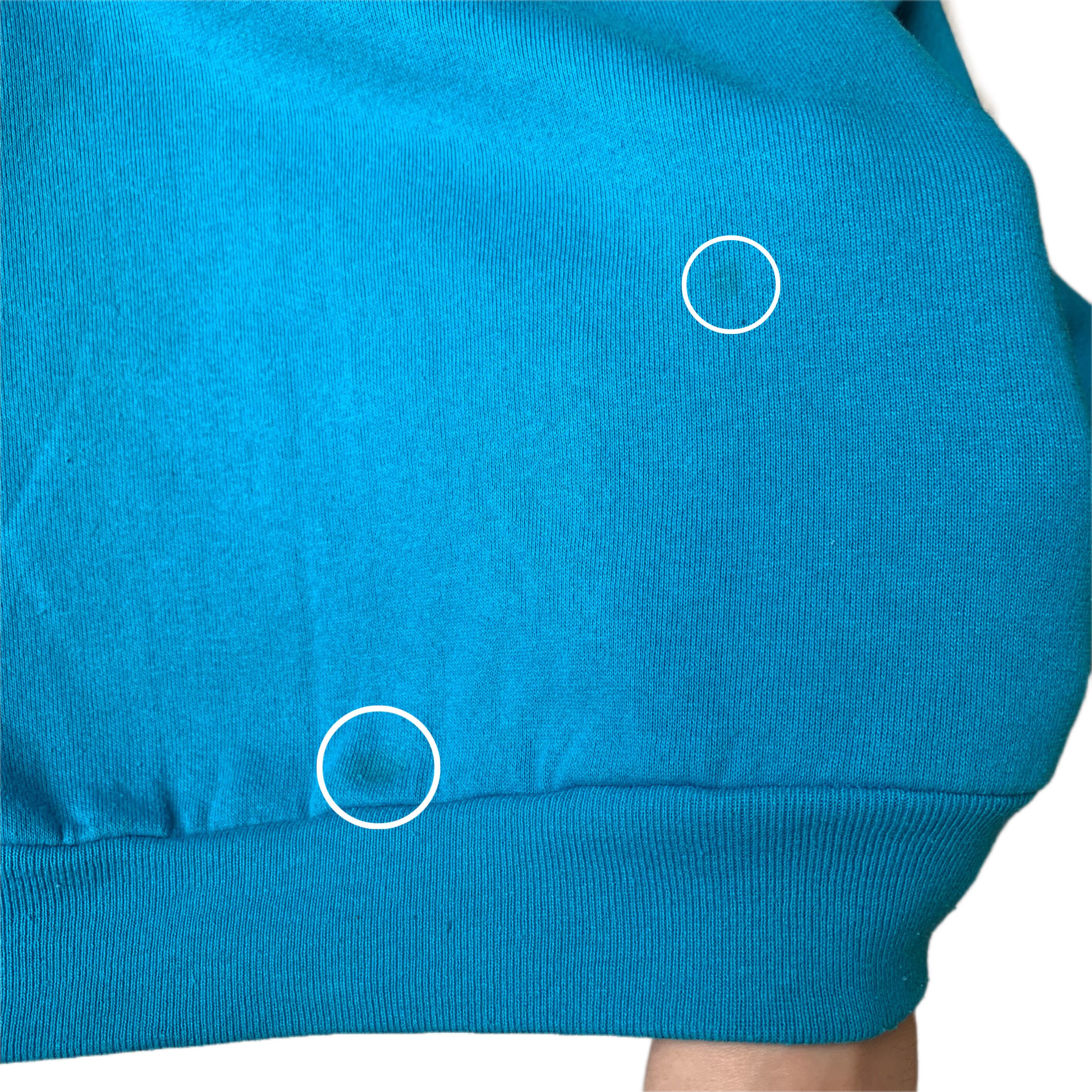 ・前身頃 右肩から右袖、左袖、左袖リブ、首リブにシミが多数ございます。