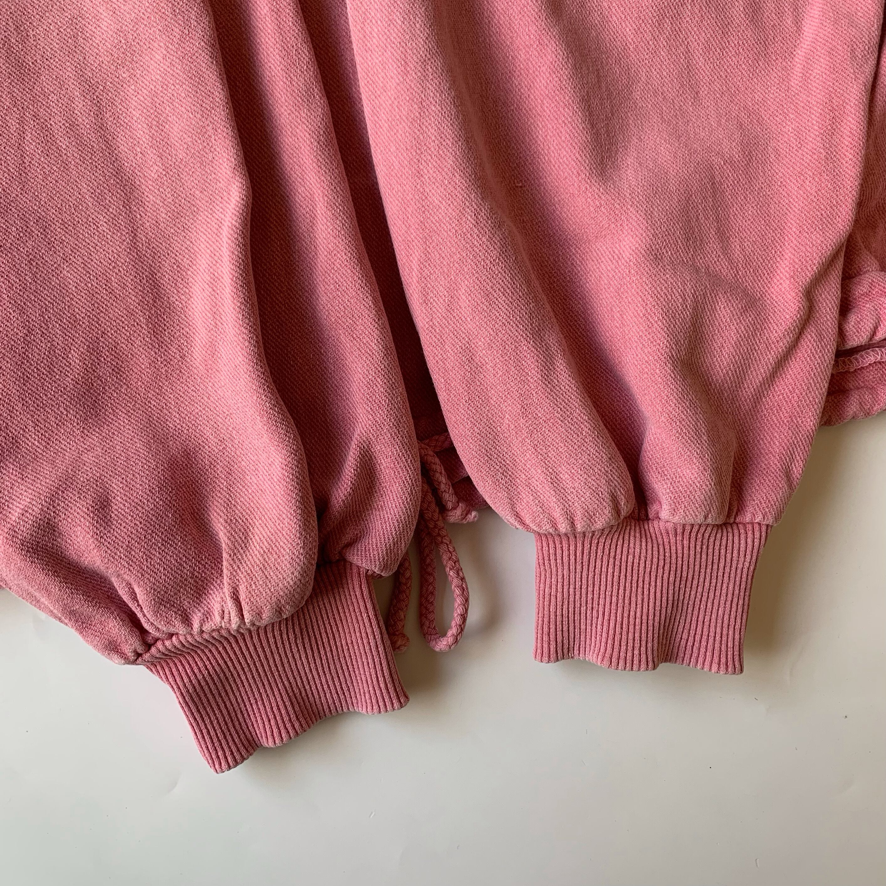 スタンドカラー。襟はドローコードで絞ることでギュッと丸首のようになります。裾にはドローコードがございますので、絞ることでシルエットを変化させる事が出来ます。