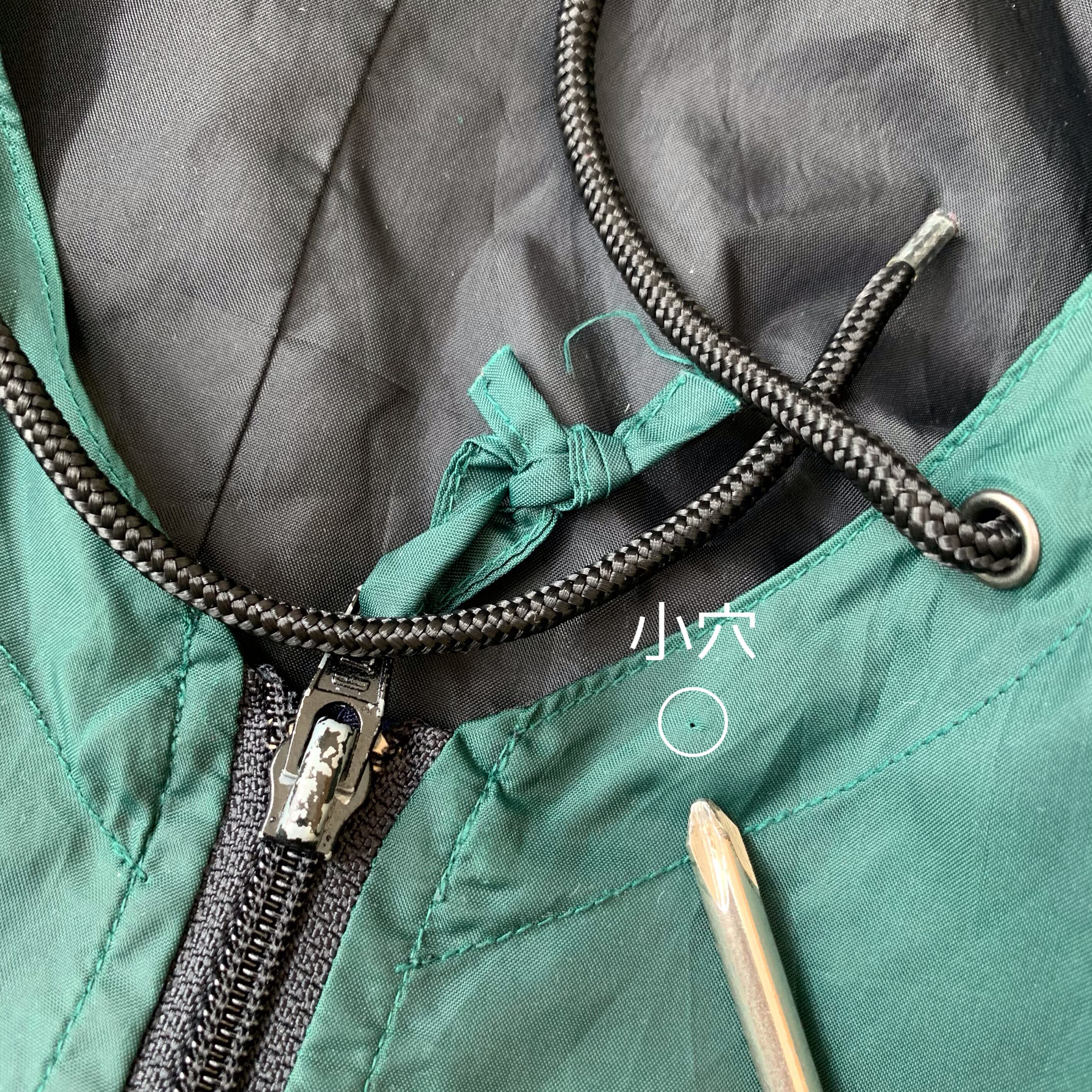 ・中央ポケット上、ハーフジップ横、左肩に小穴がございます