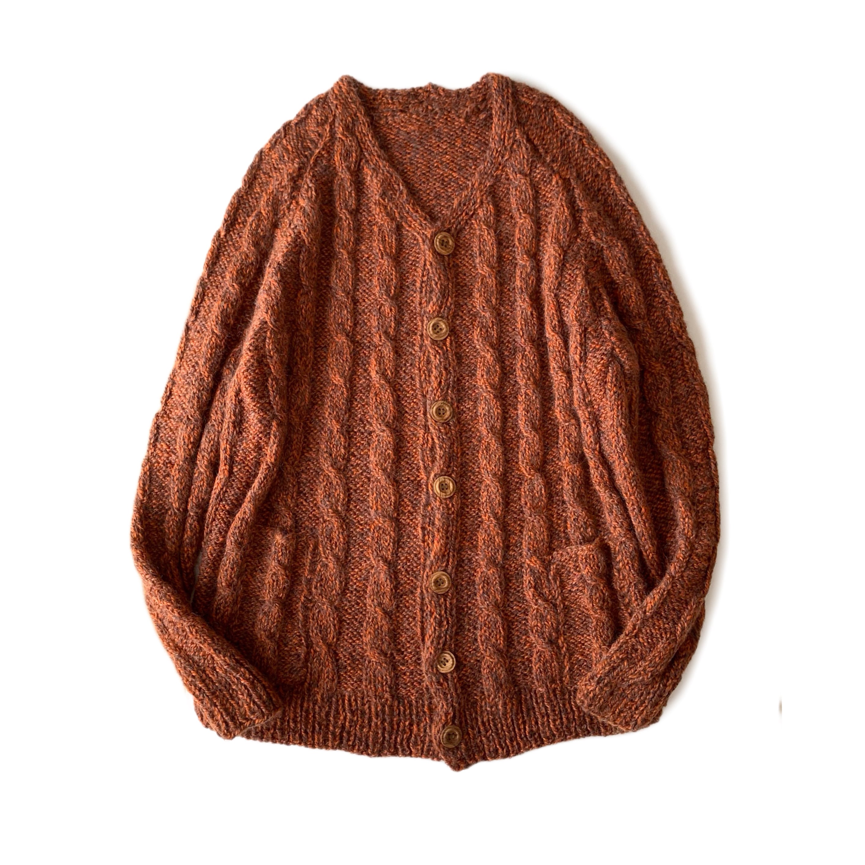 裾に連なった編み、大きなボタンが特徴的で、着心地はさほど重くなく快適にご着用いただけます。