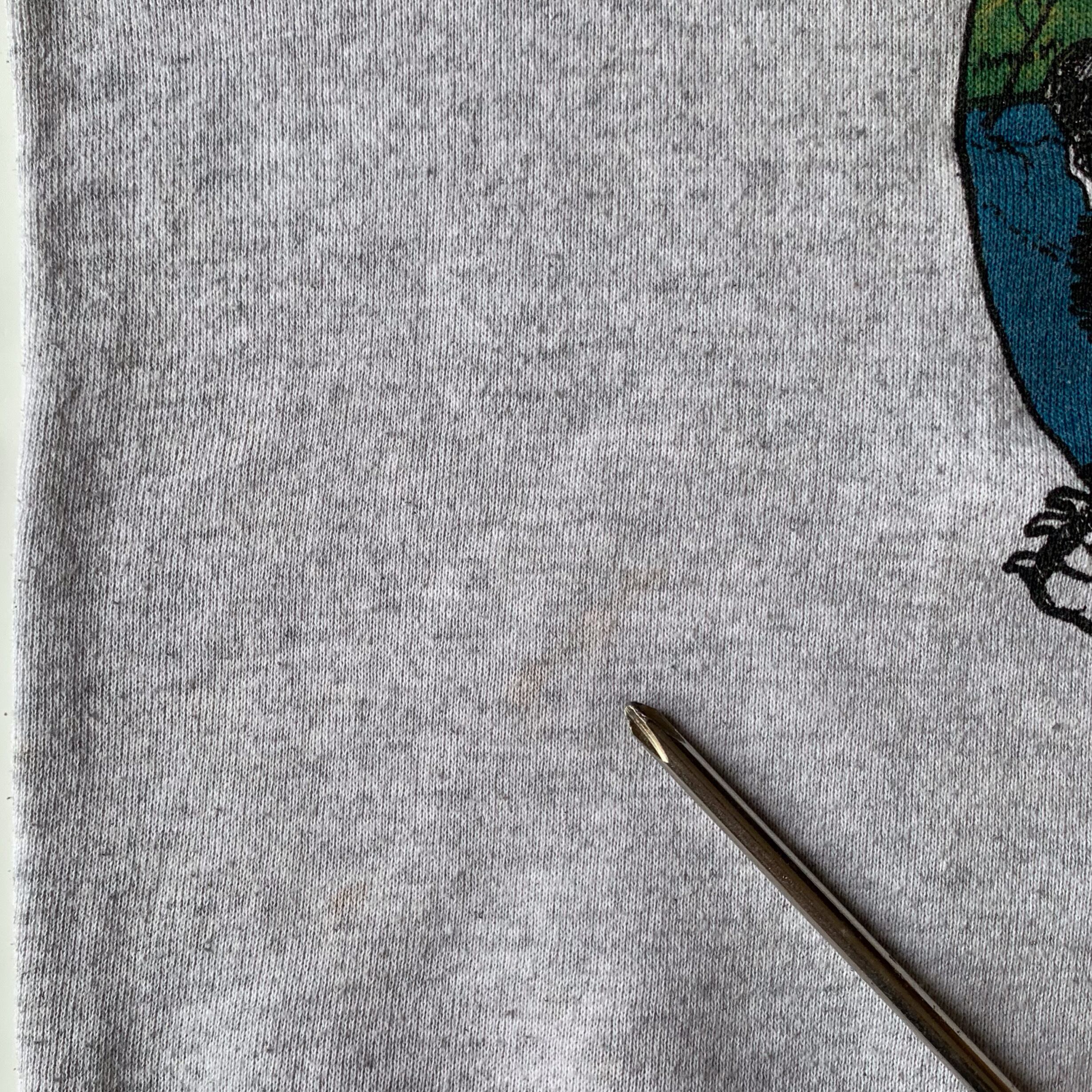 ・前身頃 裾上、プリント付近、首リブ下、右肩、両袖、後身頃 右アームホールなど所々にシミがございます。