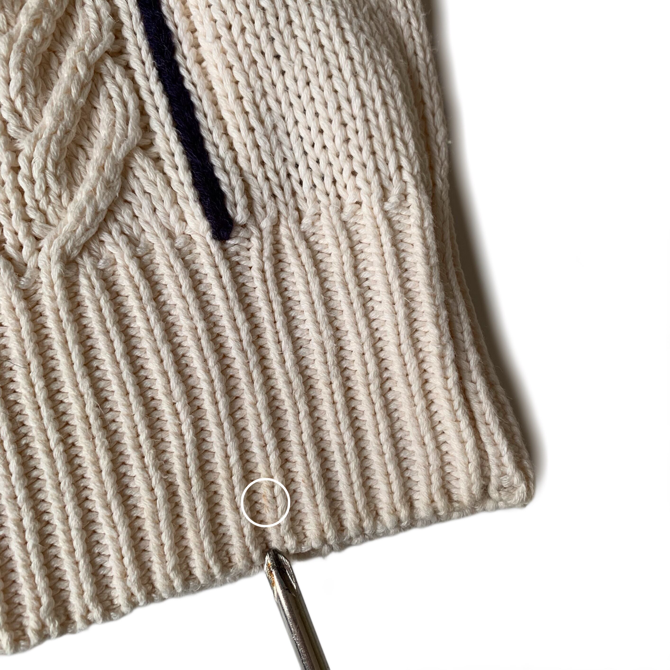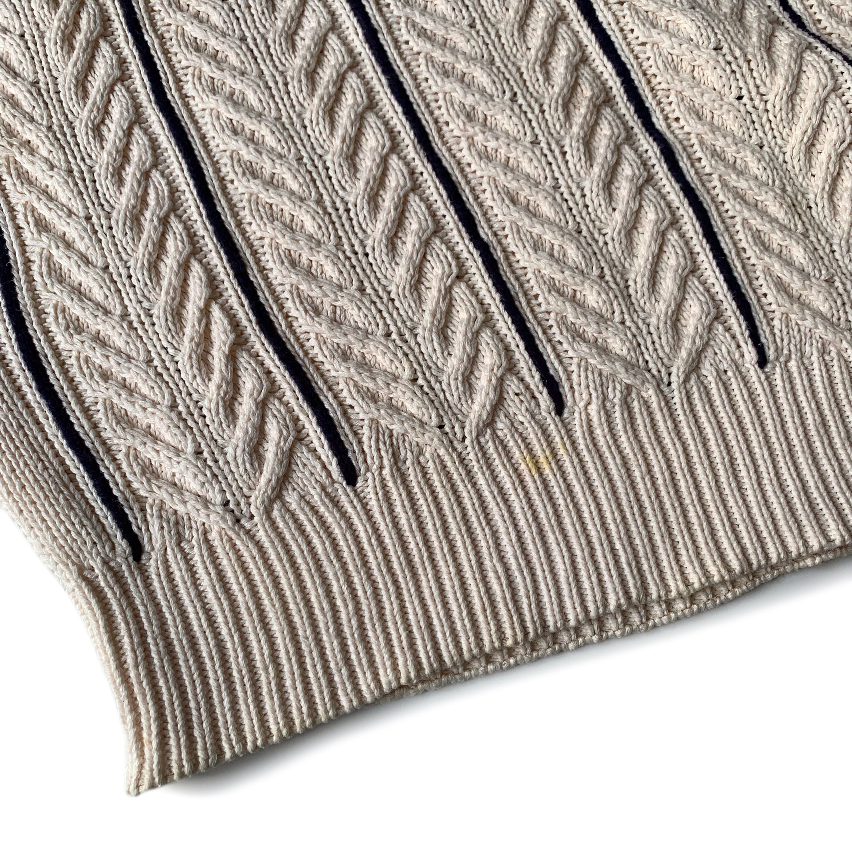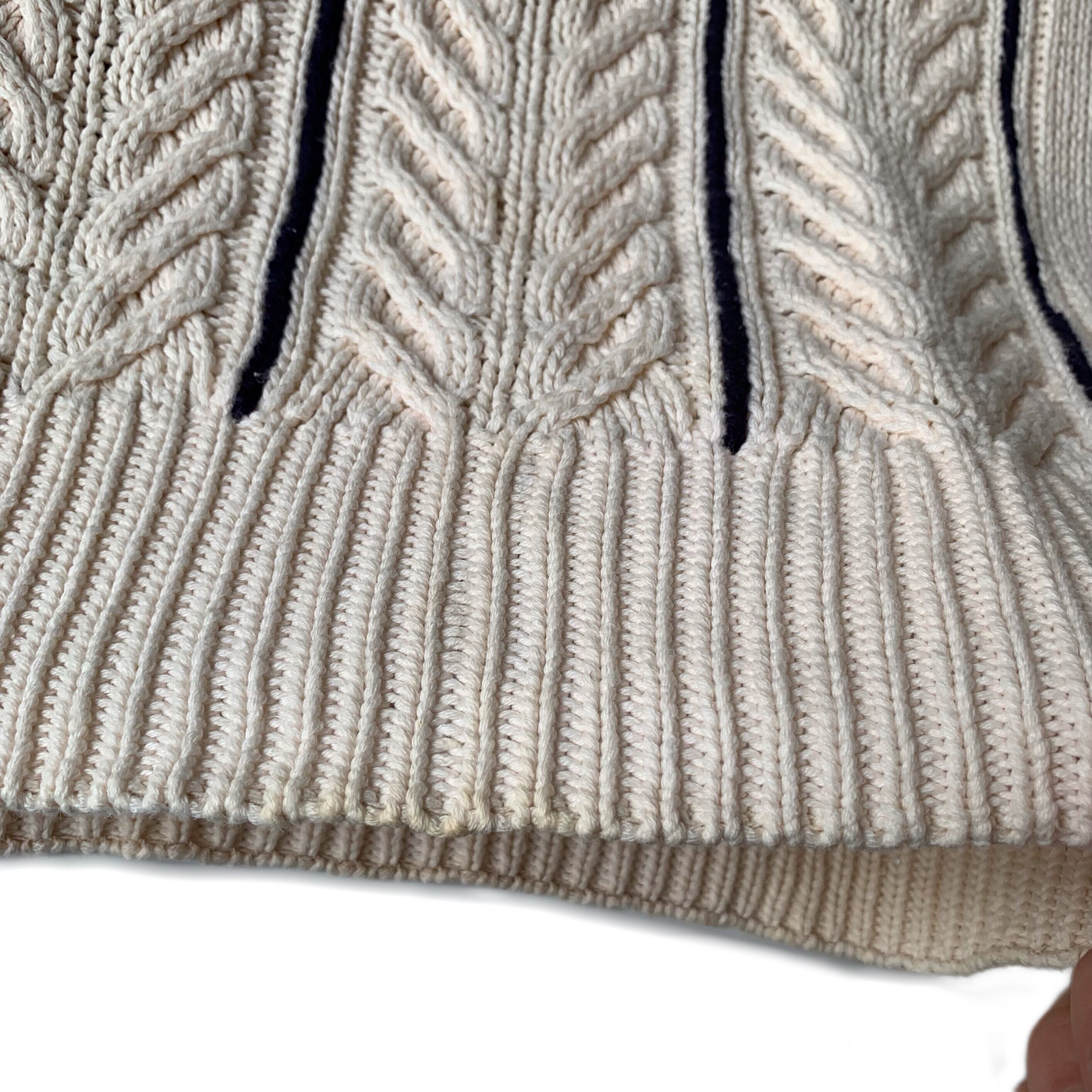 ケーブル編みにネイビーのラインが縦に入ったデザイン。