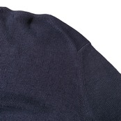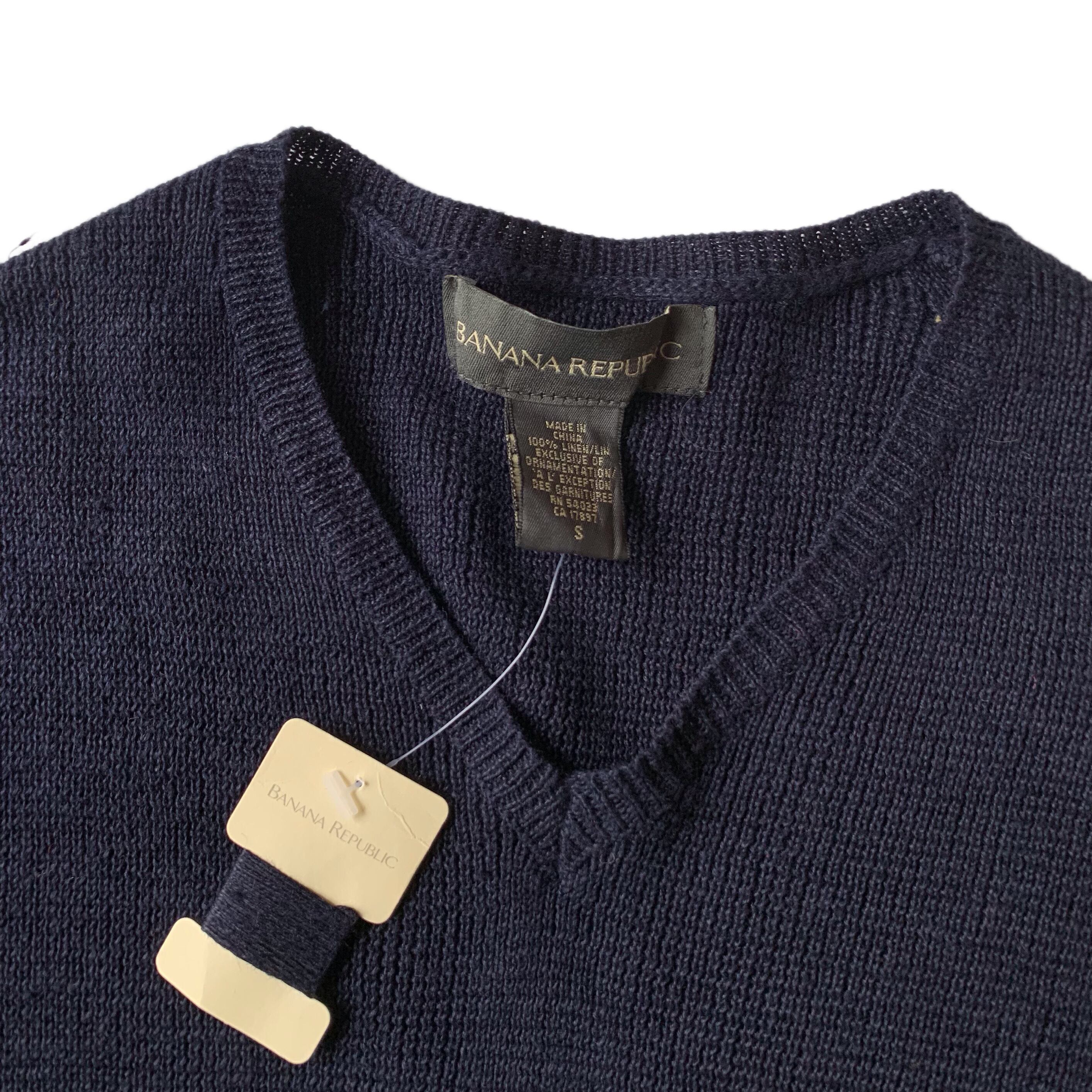 モチモチとしたリネンの肌触り、Vネック、袖や裾の水色のステッチが特徴的です。