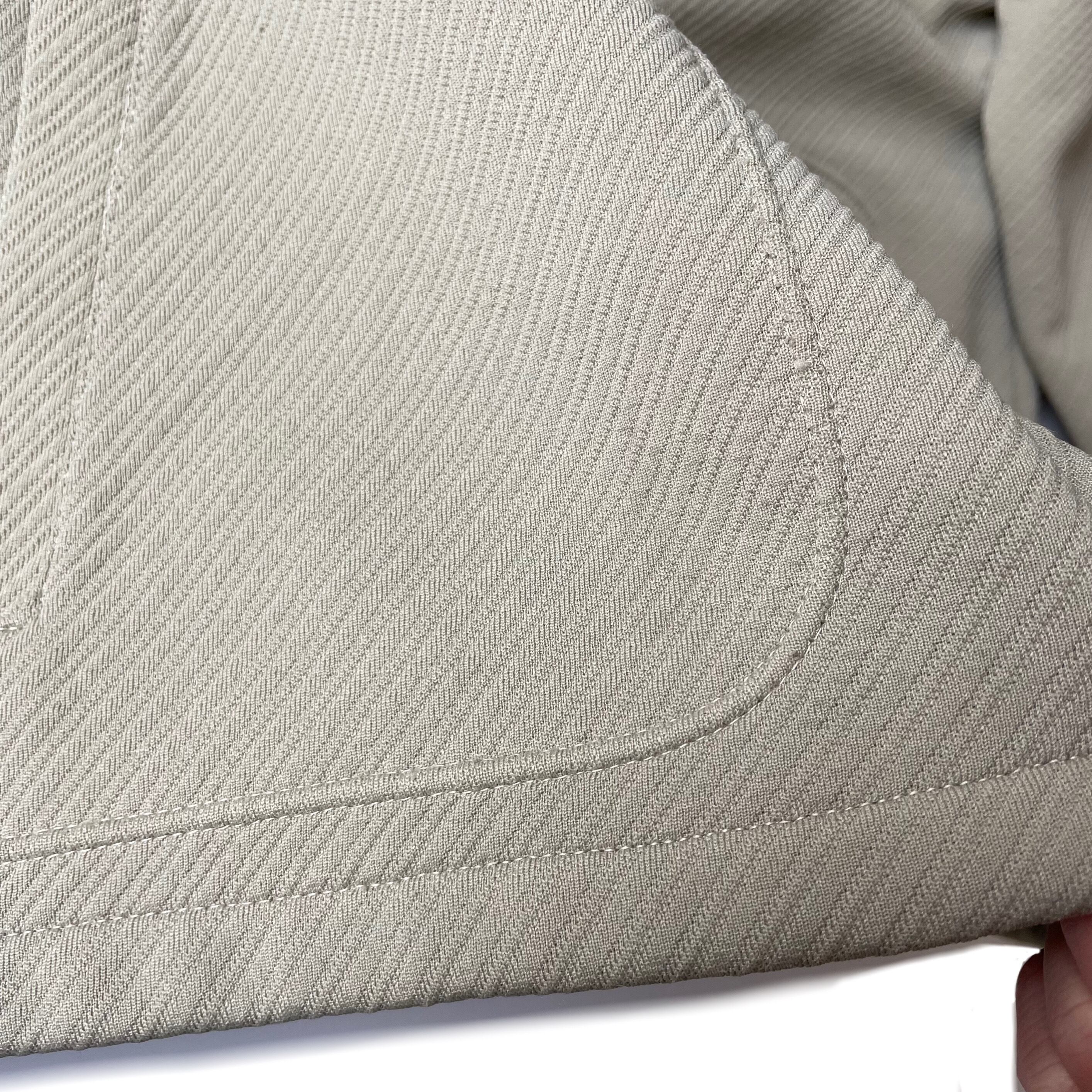 おそらくポリエステル素材。ランチャードレスパンツやスタプレのようなシワになりにくいストレッチ効いた生地感です。