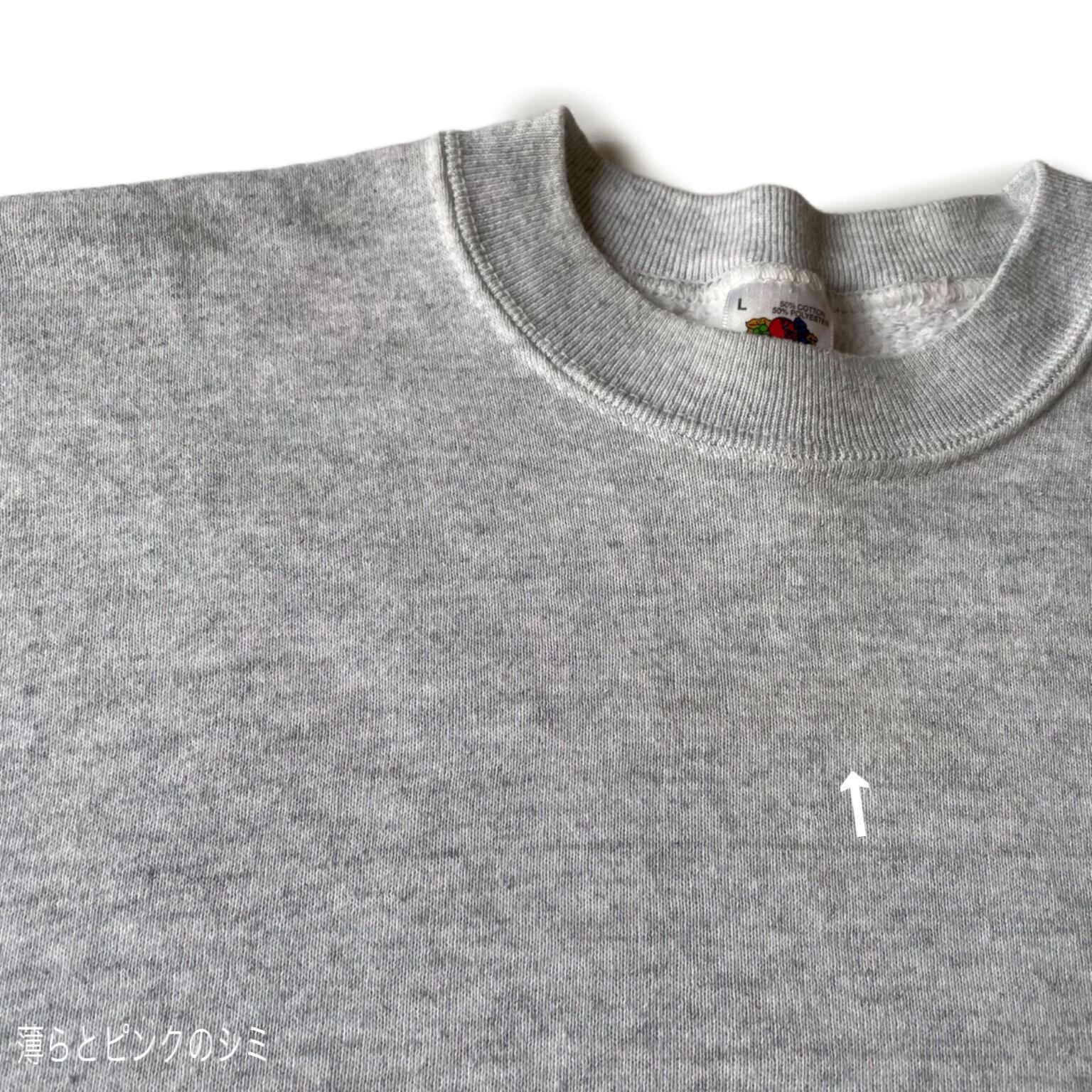 ・首リブ、首リブ付近、前身頃 裾上、右胸付近など所々に薄ピンクのシミがございます。