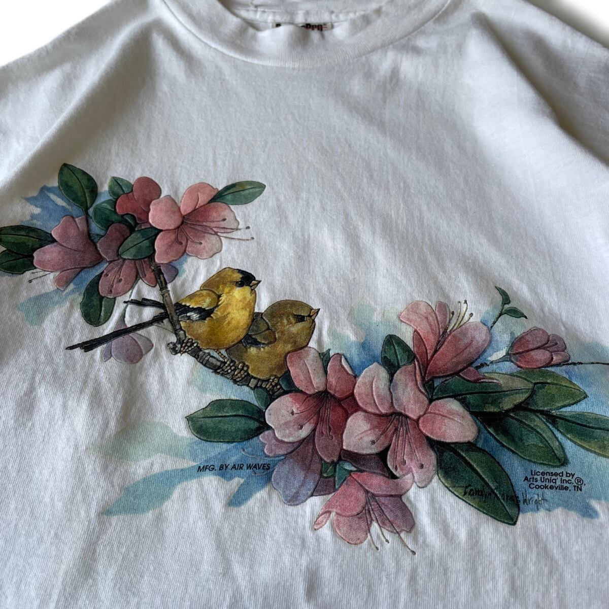 花に止まった鳥が描かれたアートなプリントのTシャツです。