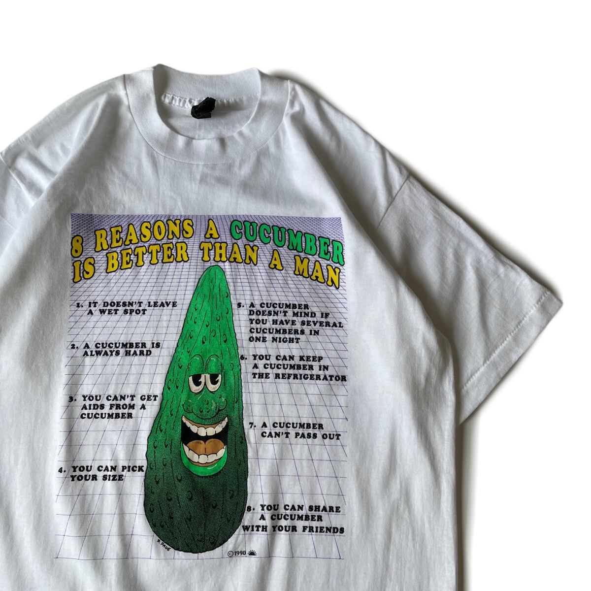 “8 REASONS A CUCUMBER IS BETTER THAN A MAN(キュウリが人間よりも優れている8つの理由)”が記されたTシャツ。