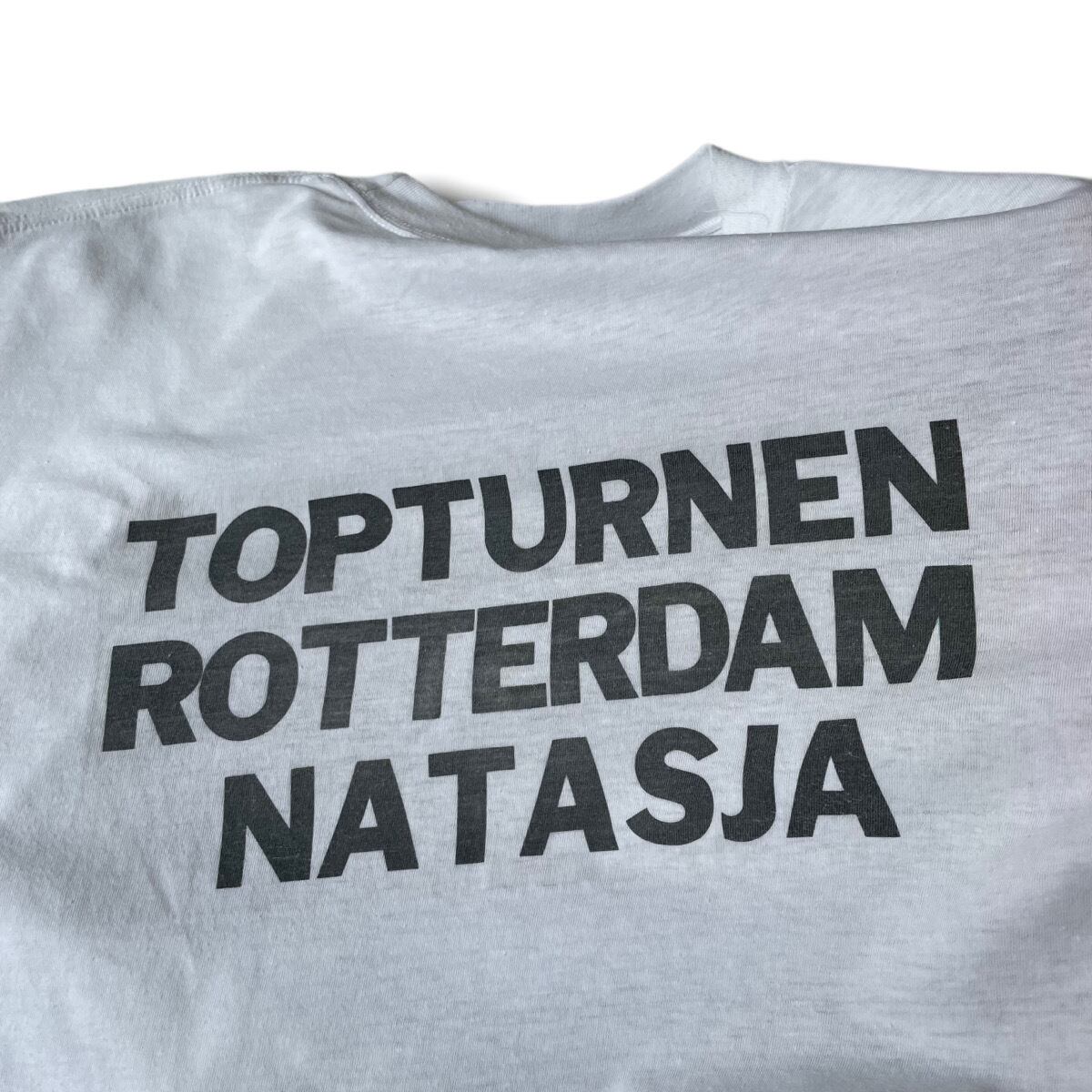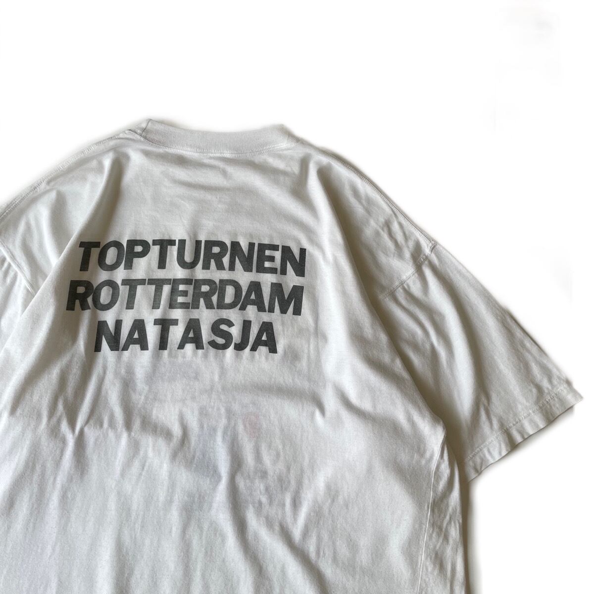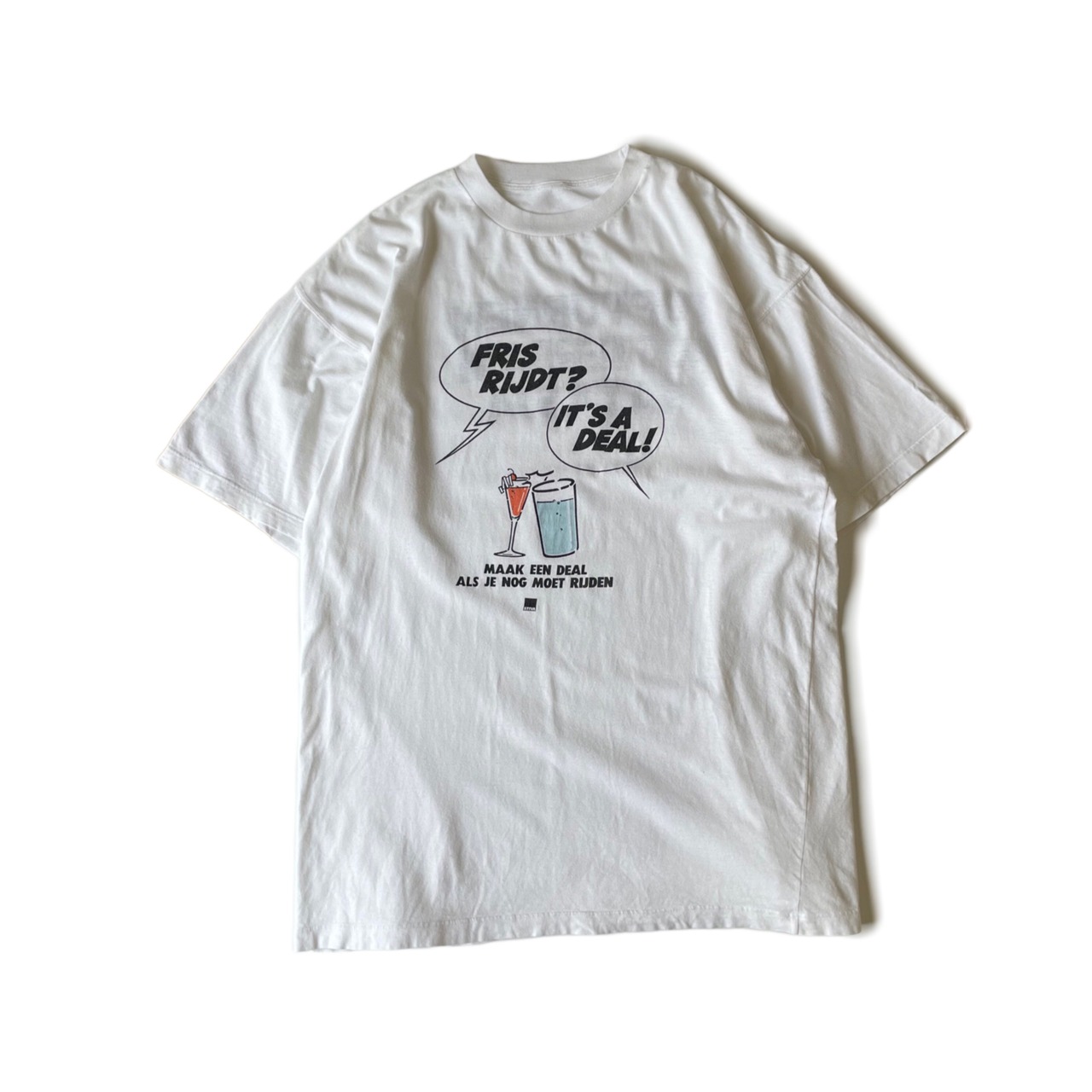 飲酒運転を注意喚起するメッセージTシャツなのでしょうか。オランダ語で会話するアルコールのイラストが描かれています。