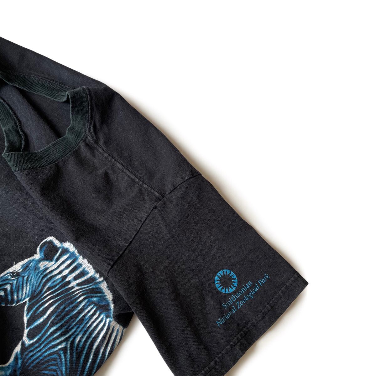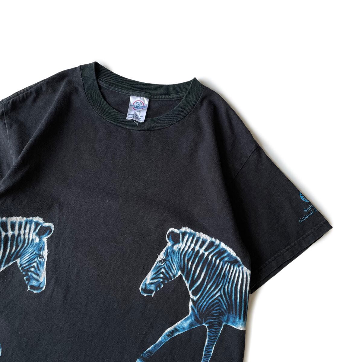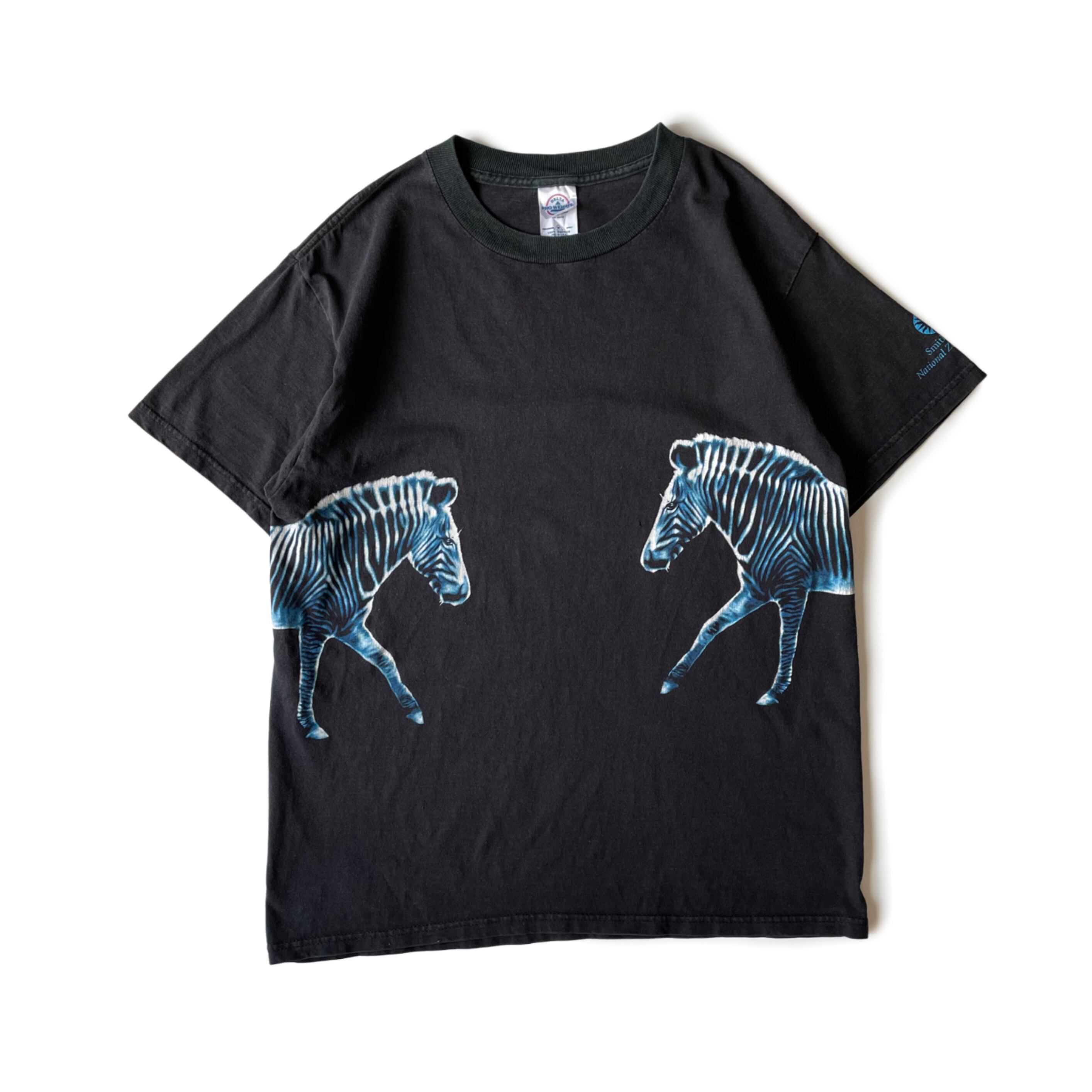 フェードしたブラックボディにシマウマの巻きプリント。元々なのか色あせたのか首リブだけ色味が異なるツートン仕様になっています。